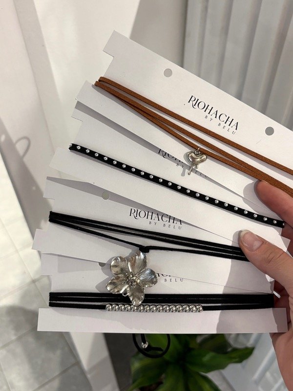 El lazo marrón con corazón suma un toque romántico, el choker de tachitas da ese detalle minimal que combina con todo, la flor grande aporta protagonista cuando querés destacar, y el lazo space agrega textura y un toque moderno.